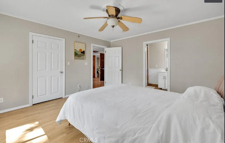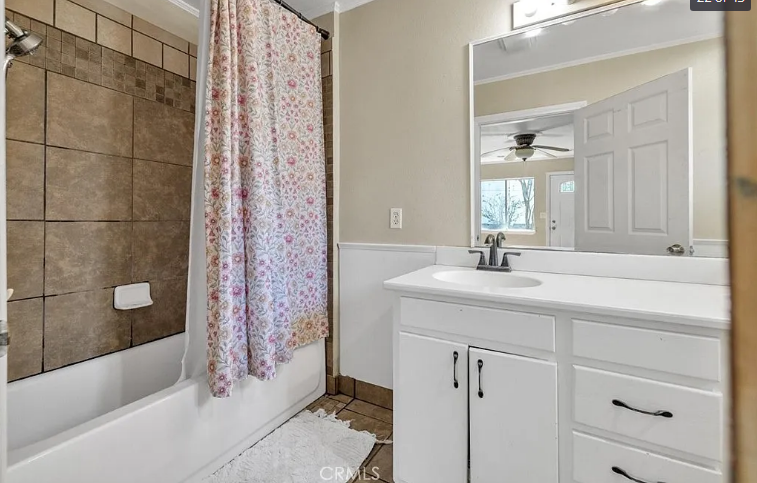 with ceiling fans, share a bathroom in the hallway that features a tiled tub/shower.